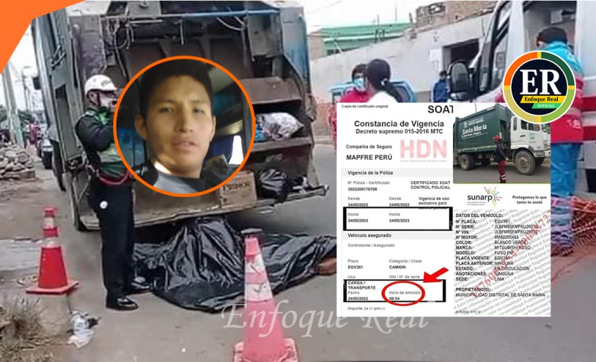 Según el sistema del MTC, el último Soat que contaba el camión compactador fue adquirido el 22 de febrero del 2021 y se le vencía el 22 de febrero del 2022. Eso quiere decir que el camión compactador ha estado trabajando 03 meses sin Soat y no contaba con dicho docuemento en el momento del accidente, que dejó cómo saldo la muerte del trabajador edil Hilario Cueva Rodrild.