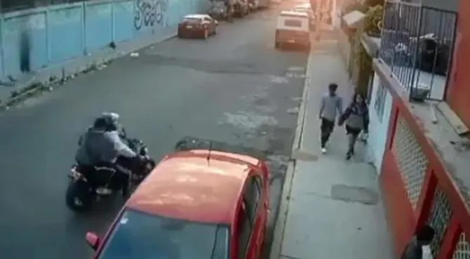 En las imágenes, se aprecia cómo los enamorados caminaban tranquilamente por la vía pública cuando dos sujetos que viajaban en motos lineales los interceptan.