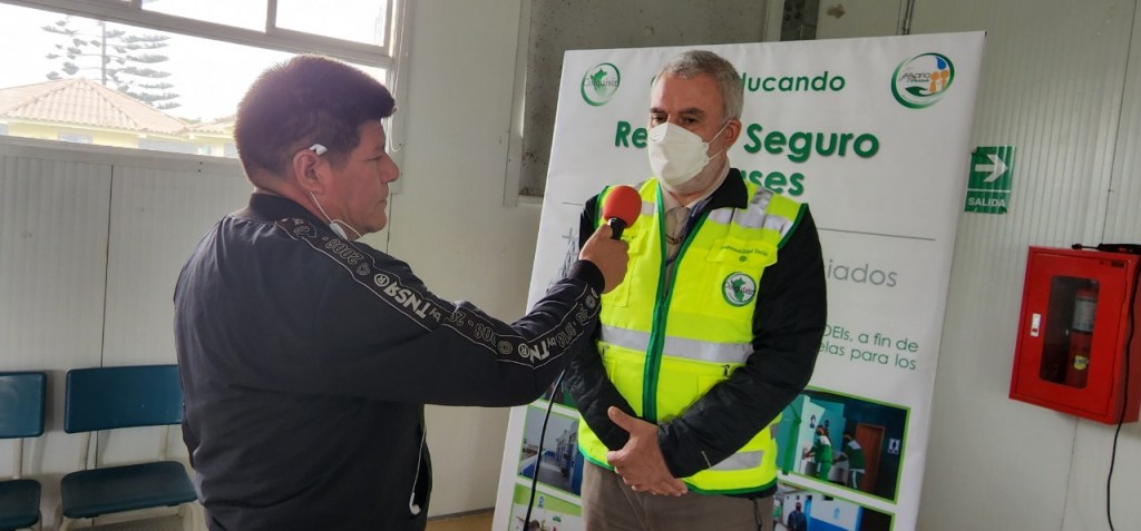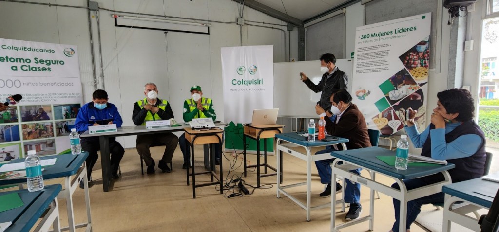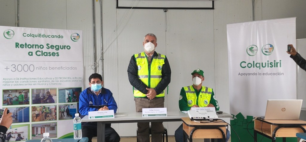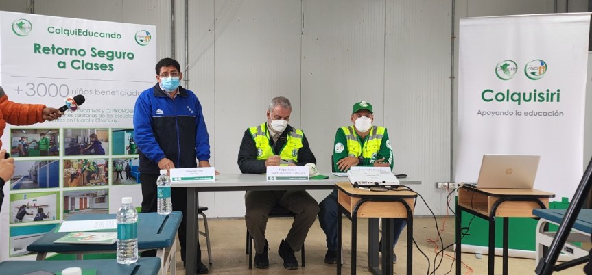 En conferencia de prensa desarrollado en el auditorio de la Institución Educativa Nuestra Señora de Fátima de Quepepampa por representantes de Minera Colquisiri sobre el apoyo que viene brindando a los colegios y PRONOEI para un retorno seguro a clase en el presente año 2022 luego de haber superado el tema de la pandemia.