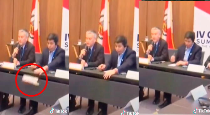 Como se puede ver en las imágenes, las cuales hasta el momento han sido visualizadas por más de 500 mil usuarios, el mandatario Pedro Castillo se encuentra presente en una conferencia de la IX Cumbre de las Américas y se dispuso a acomodar el pequeño cartel en el que figuraba su título como jefe del estado peruano. Sin embargo, por error arrojó el letrero al suelo, para luego realizar una serie de curiosos gestos.