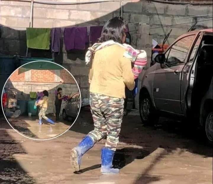 La madre estaba trabajando con su hijo en brazos mientras lava carros. La humilde mamá vestía de botas azules y cargaba a su pequeño en una manta andina demostrando que juntos pueden salir adelante.