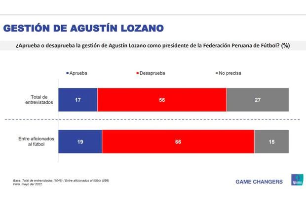 En una encuesta por encargo de El Comercio, Ipsos entrevisó a más de 1000 personas en zonas urbanas. Así, el 56% de peruanos desaprueba la gestión de Agustín Lozano como presidente de la Federación Peruana de Fútbol; y 17% la aprueba.