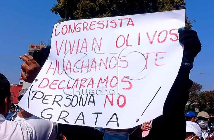 Una de ellas, fue la congresista de Lima Provincias, por Fuerza Popular ”Congresista Vivían Olivos. «Los Huachanos te declaramos persona NO GRATA ”, se leía en uno de los carteles.
