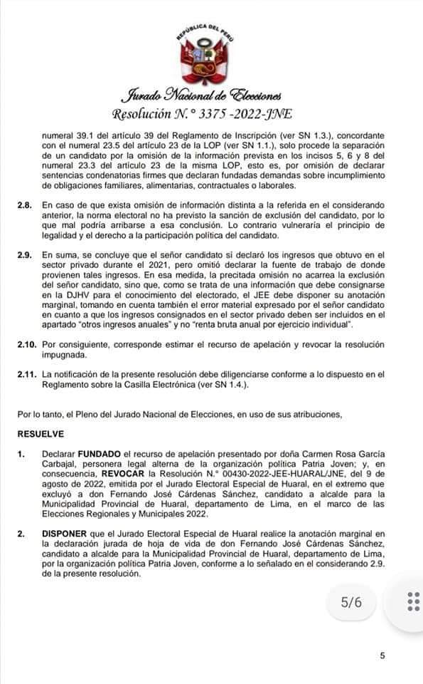 “Declarar FUNDADO el recurso de apelación presentado por doña Carmen Rosa García Carbajal, personera legal alterna de la organización política Patria Joven; y, en consecuencia, REVOCAR la Resolución N. 00430-2022-JEE-HUARAL/JNE, del 9 de agosto de 2022, emitida por el Jurado Electoral Especial de Huaral, en el extremo que excluyó a don Fernando José Cárdenas Sánchez, candidato a alcalde para la Municipalidad Provincial de Huaral, departamento de Lima, en el marco de las Elecciones Regionales y Municipales 2022”, se lee.