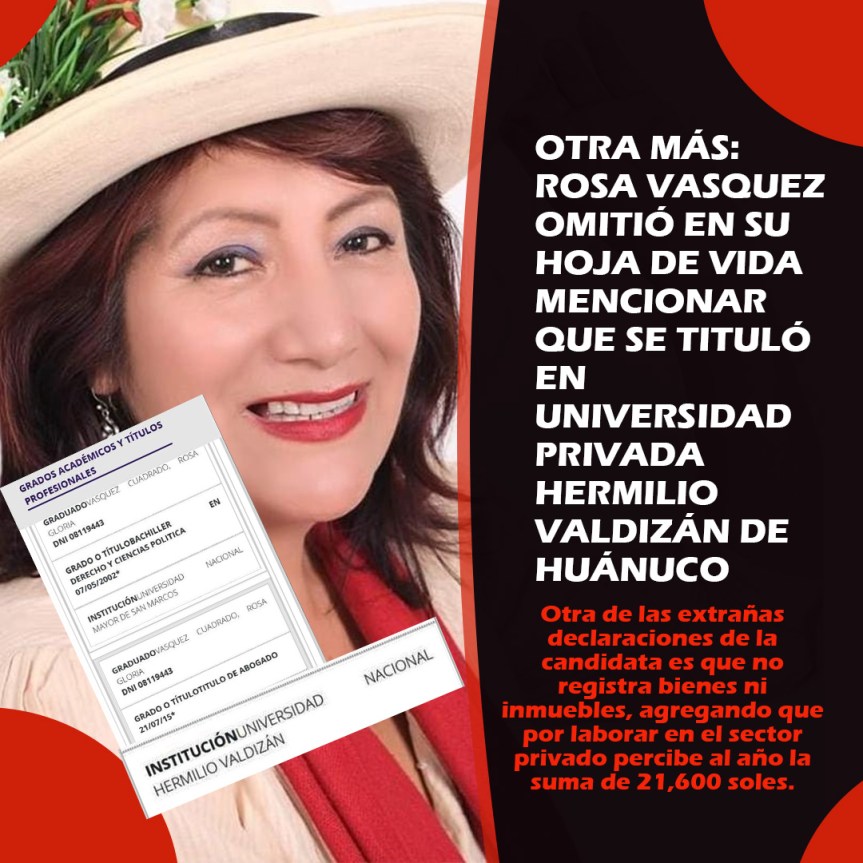 Otra más: Rosa Vásquez omitió en su HDV mencionar que se tituló en universidad privada Hermilio Valdizán de Huánuco