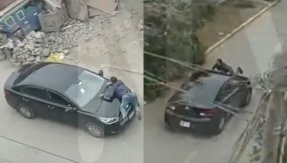 En ese instante, los delincuentes sacaron sus armas y lo encañonaron para luego botarlo de su taxi. En el video se aprecia que en su desesperación el taxista se lanzó sobre el capó de su auto para tapar la visión del ladrón que manejaba la unidad.