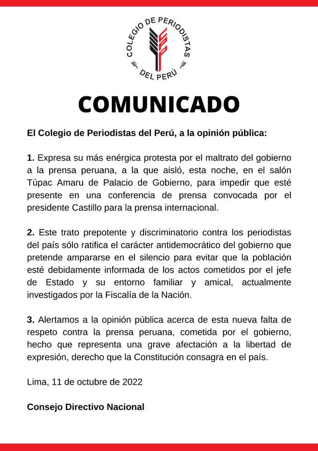 “Este trato prepotente y discriminatorio contra los periodistas del país sólo ratifica el carácter antidemocrático del gobierno que pretende ampararse en el silencio para evitar que la población esté debidamente informada de los actos cometidos por el jefe de Estado y su entorno familiar y amical, actualmente investigados por la Fiscalía de la Nación”, señalan en el comunicado.