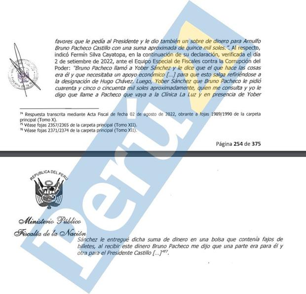 “Siendo que, respecto a este último monto, Bruno Pacheco se lo entregó al presidente Pedro Castillo en las instalaciones de Palacio de Gobierno”, se lee en el documento.