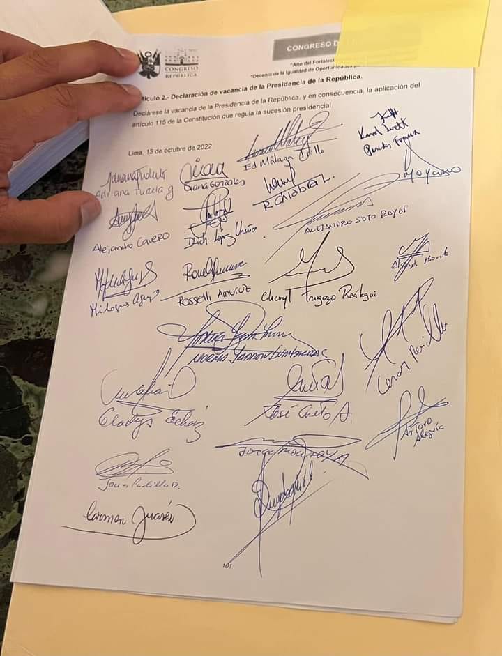 En total se necesitan 26 firmas para poder presentar formalmente esta tercera moción de vacancia contra el presidente Pedro Castillo
