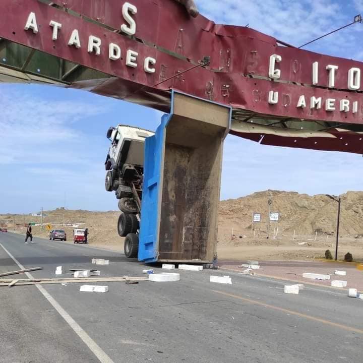 El camión volquete GS – 412 del municipio de Brea Negritos, en Piura, impactó contra el pórtico principal de la entrada al distrito. Según el conductor, estaba pasando por esta zona cuando de repente se le abrió la tolva, lo cual hizo que el vehículo se levante y destruya parte de esta obra construida recientemente.