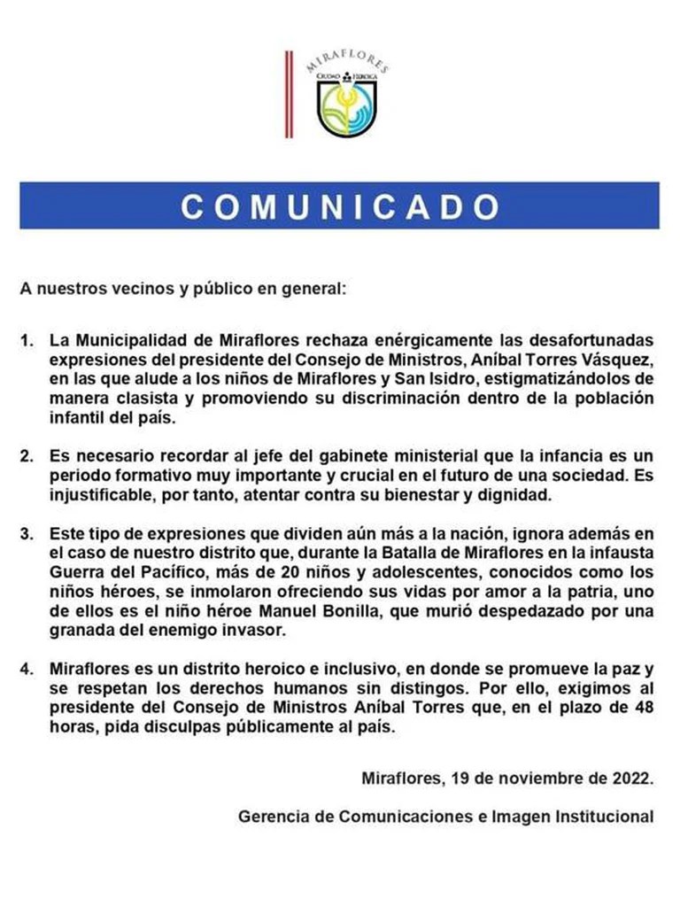 La Municipalidad del distrito de Miraflores emitió un comunicado, solicitando las disculpas públicas de Aníbal Torres tras sus últimos comentarios en donde habló en contra de los niños de este distrito.