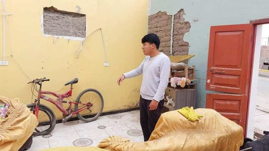 Varios de sus artefactos como televisor, computadora, bicicleta, estantes, sillas, además del techo y parte de la pared de adobe de su casa han quedado seriamente dañados.