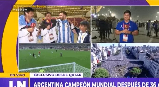 Todos los medios al culminar el encuentro buscaban alguna declaración de los hinchas argentinos, quienes felices respondían a las preguntas de la prensa. Así sucedió para la señal nacional Latina, donde sus corresponsales en Qatar captaban a cualquier fanático con la esperanza de una dinámica y graciosa entrevista en vivo.