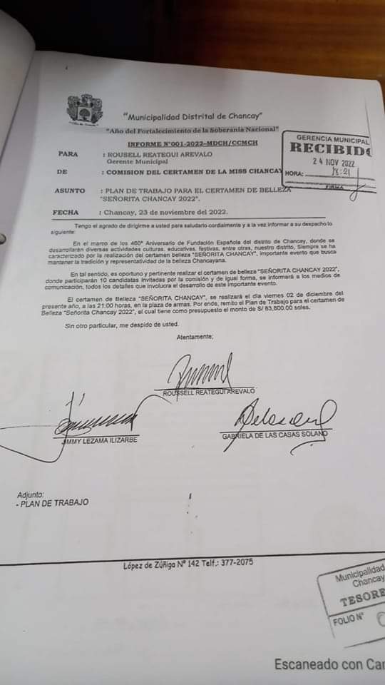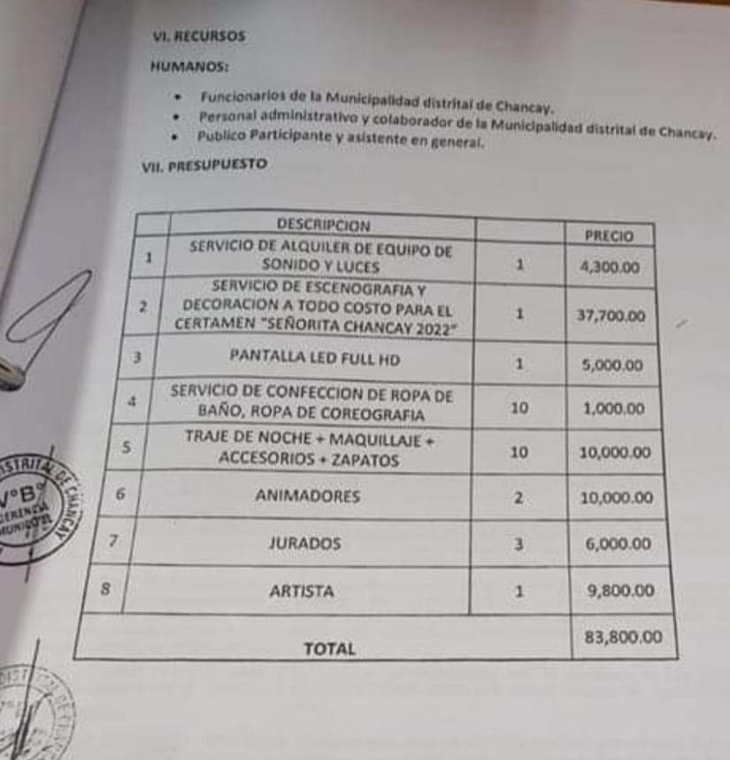 · Documentos donde se aprueban los gastos para el certamen de belleza Miss Chancay de 83,800 soles.