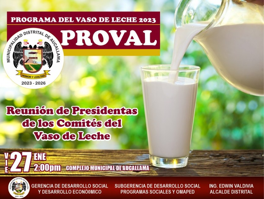 La Oficina Responsable del Programa Alimenticio Salud ha informado que el día viernes 27 de enero, a las 2:00 de la tarde, en el Complejo Municipal de Aucallama, sostendrán una importante reunión de trabajo.