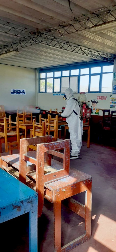 Con el fin de generar un ambiente libre de organismos patógenos, la Sub Gerencia de Salud y Sanidad acudió esta mañana hasta la Institución Educativa 20405 “Salvador de las Casas Dulanto” de la Huaca y al Colegio 20901 José Faustino Sánchez Carrión de Huacho Chico, para desinfectar sus ambientes con amonio cuaternario.