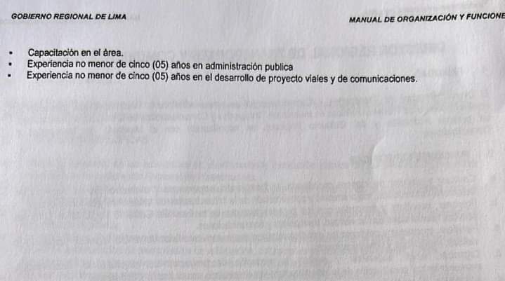 Organizar, dirigir, supervisar y evaluar en la ejecución de proyectos de mejoramiento, rehabilitación, mantenimiento y construcción de la infraestructura vial de acuerdo al ámbito jurisdiccional, proponer, coordina y concretar con los órganos normativos del gobierno regional las políticas relacionadas con la vialidad, transportes y comunicaciones; entre otras funciones específicas que el mencionado bachiller en ingeniería de sistema y computo no podrá cumplir por desconocimiento profesional.