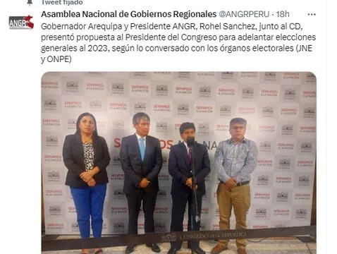 «El Consejo Directivo de la ANGR nos hemos reunido con el Jurado Nacional de Elecciones y con la ONPE para ver si hay la posibilidad de unas elecciones en el 2023. ¿La población qué pide? Que se vaya el Ejecutivo y Legislativo. Nosotros, como autoridades electas y en un proceso de transición democrática, también tenemos que ver la parte de la legalidad», dijo Rohel Sánchez.