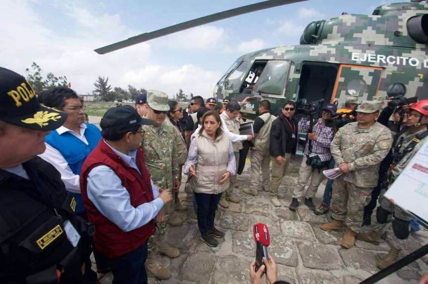 La presidenta Dina Boluarte sobrevuela las zonas afectadas por un huaico en la región Arequipa, en el marco del despliegue de ayuda humanitaria y apoyo médico enviado por el Gobierno para la población damnificada de dicha jurisdicción.