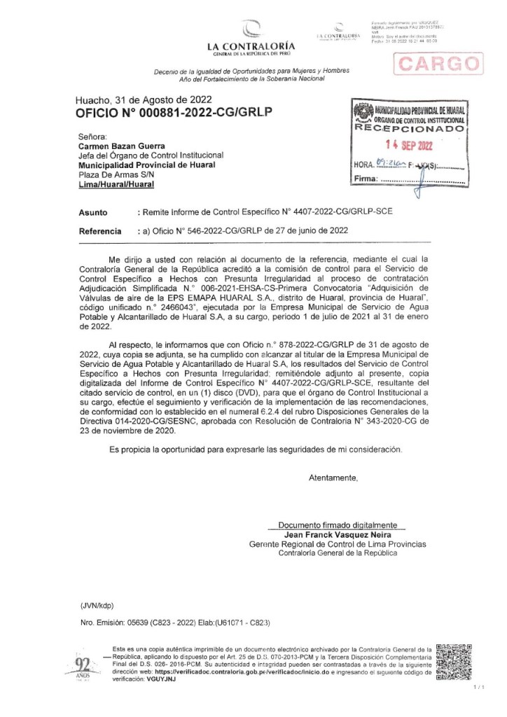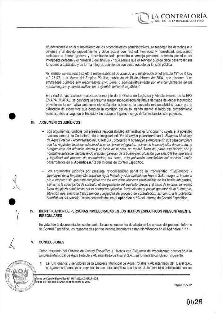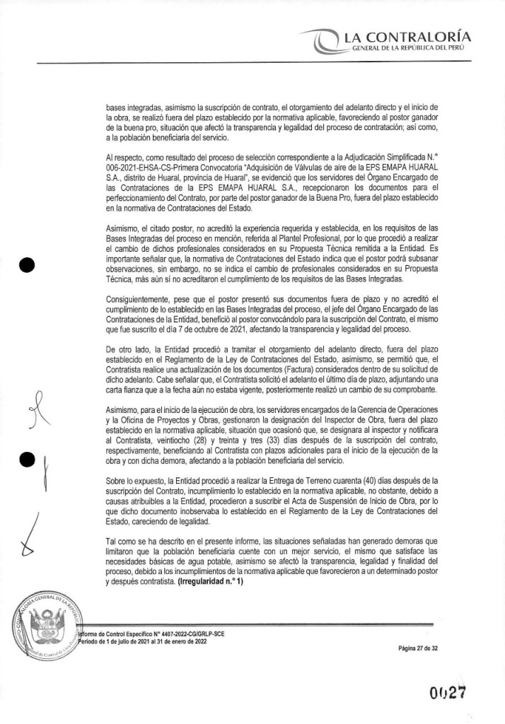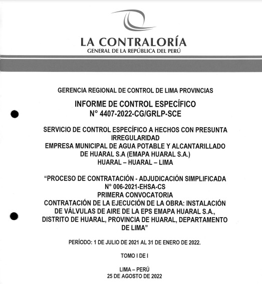 Contraloría General a través del Informe de Control Específico N° 4407-2022-CG/GRLP-SCE, reveló que miembros del Comité de Proceso de Selección de la obra: “CONTRATACIÓN DE LA EJECUCIÓN DE LA OBRA INSTALACIÓN DE VÁLVULAS DE AIRE DE LA EPS EMAPA HUARAL S.A»., habrían cometido una serie de irregularidades en donde se concluye que habrían favorecido al postor y luego al ganador de la buena pro.