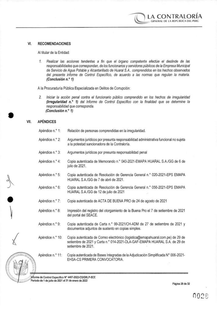 En las recomendaciones de este contundente informe que revelaría presuntos actos de corrupción de funcionarios y servidores del OTASS-EMAPA HUARAL, al titular de la entidad se le recomienda actuar conforme a sus atribuciones a fin que los funcionarios y servidores, deslinden responsabilidades.
