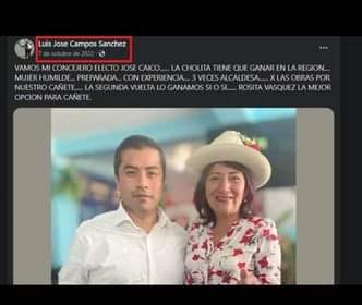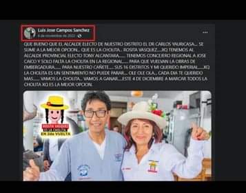 Tal como como figura en las redes sociales del señor LUIS CAMPOS SANCHEZ, declara abiertamente ser partidario del PARTIDO UNIDAD CÍVICA LIMA y brinda su apoyo constante a la actual gobernadora regional ROSA GLORIA VÁSQUEZ CUADRADO, apoyo que le habría servido (presumimos) de forma ventajosa para favorecerse en el cargo de ESPECIALISTA EN TESORERÍA en la UELS; del filtro realizado también se observa su acercamiento con otras gestiones ediles muy cuestionadas.