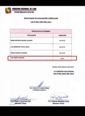 En el resultado curricular el único apto que pasa a la etapa de entrevista fue el señor LUIS CAMPOS SANCHEZ, no indican el motivo de descalificación de los demás postulantes; posteriormente en la etapa de entrevista, el señor LUIS CAMPOS SANCHEZ (único postulante en carrera) resulta ganador a la plaza de Especialista en Tesorería, dando validez del acto firman como parte de la Comisión Evaluadora, el BACH. GARRI L. S. LOZANO OCHOA en calidad de presidente, el ECON. HUGO S. DE LA CRUZ SOLO y la CPC. IRMA M. MENDIETA CASAS, como miembros.