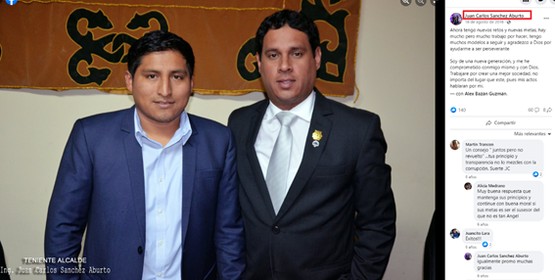 El señor JUAN CARLOS SANCHEZ ABURTO, es el ex candidato a la alcaldía de la Municipalidad Distrital de Imperial con el PARTIDO UNIDAD CÍVICA LIMA “LA CHOLITA” (2018), regidor de la Municipalidad Provincial de Cañete en la gestión de ALEXANDER JULIO BAZAN GUZMAN del PARTIDO UNIDAD CÍVICA LIMA “LA CHOLITA” (2016) y amigo cercano de HORACIO HINOSTROZA DELGADO (Miembro de la Comisión Evaluadora) como se muestra en las imágenes, pues su cercanía con ROSA GLORIA VÁSQUEZ CUADRADO y HORACIO HINOSTROZA DELGADO le habría servido supuestamente para ganar la plaza de Subgerente de Infraestructura y Transporte.