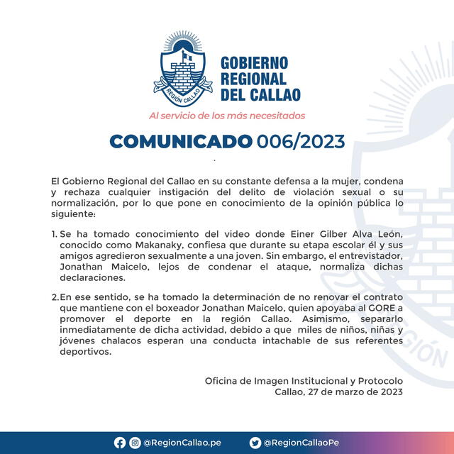A través de una publicación en Twitter, el Gobierno Regional del Callao comunicó que no renovará el contrato que tiene con Jonathan Maicelo en la promoción de boxeo. El GORE señaló que el deportista tomó a la ligera las declaraciones sobre una violación realizada por el influencer Makanaky, ya que —lejos de condenar el ataque— normalizó dichas expresiones.