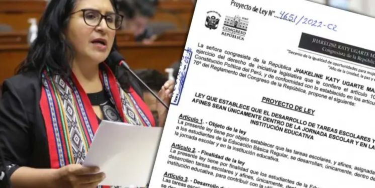Mediante el proyecto de ley 4651-2022-CR, la congresista de la República, Katy Ugarte Mamani propone establecer que el desarrollo de tareas escolares y afines sean únicamente dentro de la jornada escolar y en la institución educativa.