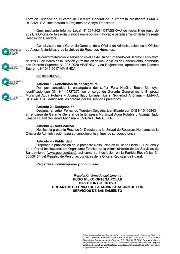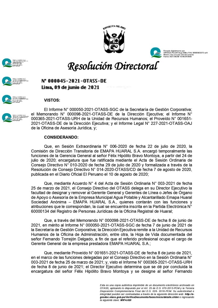 ¿No hay otra persona capaz que pueda asumir este cargo? El recientemente designando como flamante gerente general del OTASS_EMAPA HUARAL, Fernando Torrejón, ya ostentó este cargo y fue designado mediante resolución Directoral N° 00045-2021-OTASS-DE, el pasado 09 de junio del año 2021.