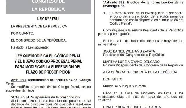 La Ley 31751 fue publicada este jueves, 25 de mayo de 2023 en la separata digital de normas legales del diario El Peruano, por lo que entró en vigencia desde las 00:00 horas de hoy, 26 de mayo de 2023. Así, como mínimo cualquier delito con una pena máxima de dos años cometido hasta antes del 25 de mayo del 2019 ha prescrito.