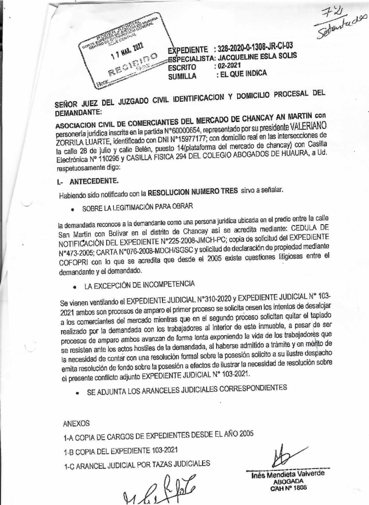 Mediante Resolución N° 07 de fecha 08 de junio del 2023, el Primer Juzgado Civil de Huacho, declaró improcedente el interdicto de retener interpuesto por la ASOCIACION CIVIL DE COMERCIANTES DEL MERCADO SAN MARTIN DE CHANCAY representada por su presidente VALERIANO ZORRILLA LUARTE y la defensa técnica a cargo de la abogada INÉS MENDIETA VALVERDE, en el Primer Juzgado de Huacho, cuando el Juez competente es el del Juzgado Civil de Chancay por ser el domicilio de la Municipalidad distrital de Chancay ,conforme al art 17 del Código Procesal Civil