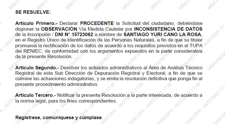 Se dispone la Observación vía medida cautelar por inconsistencia de datos de la inscripción de datos de la Inscripción, a fin de que el ciudadano Cano La Rosa promueva la rectificación de los datos de su DNI.
