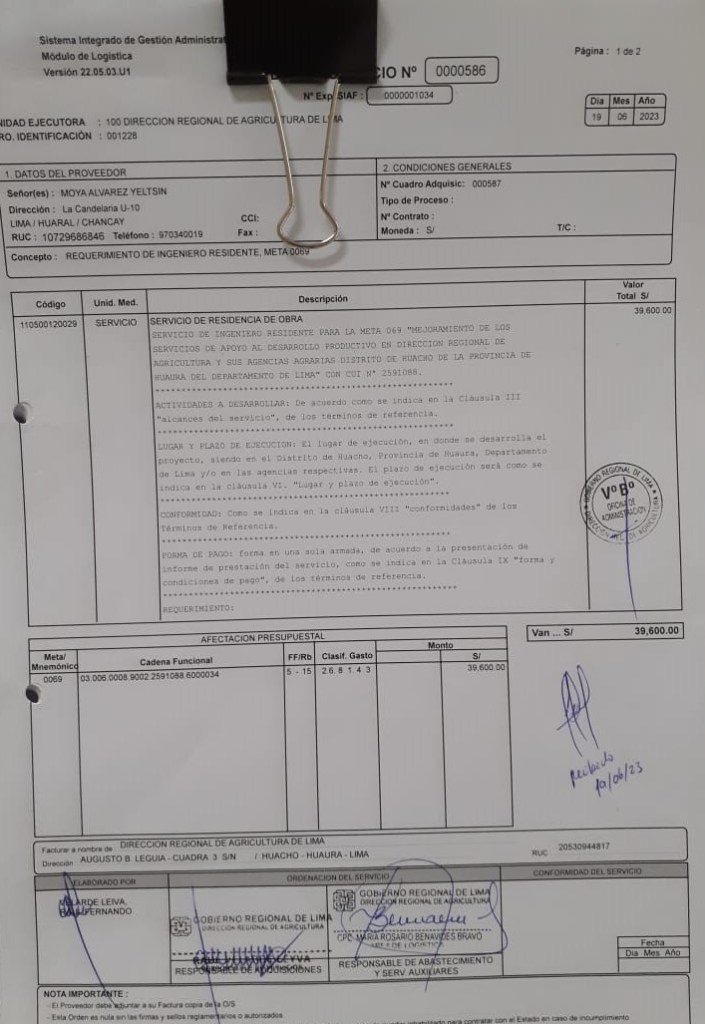 3.- Orden de servicio N° 0000584 del 19 de junio del 2023, se ordena el pago de 39, 600 soles a favor de YELSINT MOYA ÁLVAREZ, por el servicio de residente del proyecto “Mejoramiento de los servicios de apoyo al desarrollo productivo de la Dral y agencias agrarias.