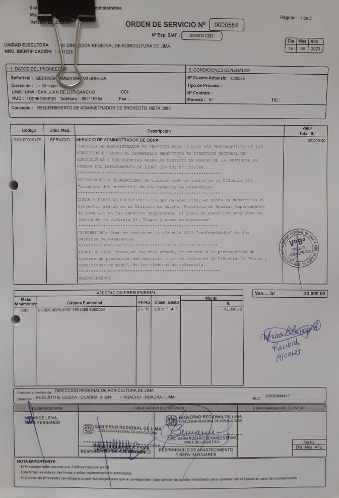 1.- Orden de servicio N° 0000584 del 19 de junio del 2023, se ordena el pago de 32, 000 soles a favor de MIRIAM BERROSPI CAMBIA, por el servicio de administrador del proyecto “Mejoramiento de los servicios de apoyo al desarrollo productivo de la Dral y agencias agrarias.