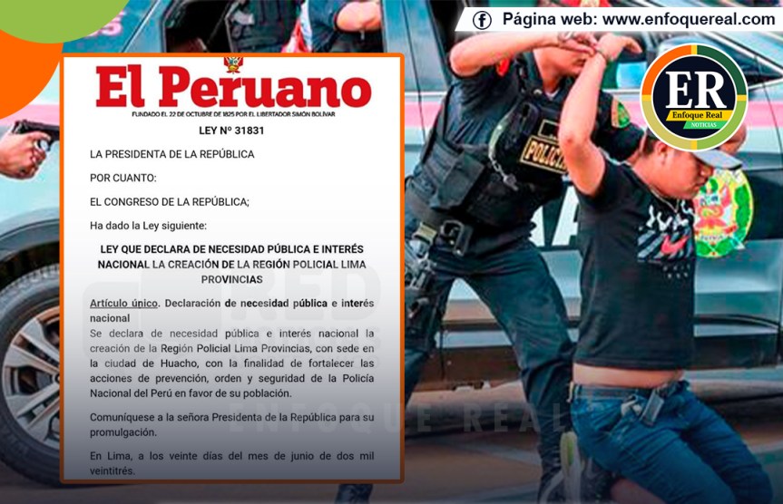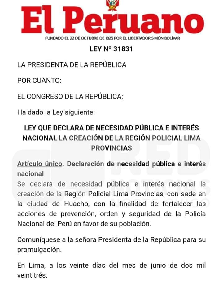 Declaran de necesidad pública e interés nacional la Creación de la Región Policial en Lima Provincias. La ley fue publicada hoy, en el Diario Oficial El Peruano.