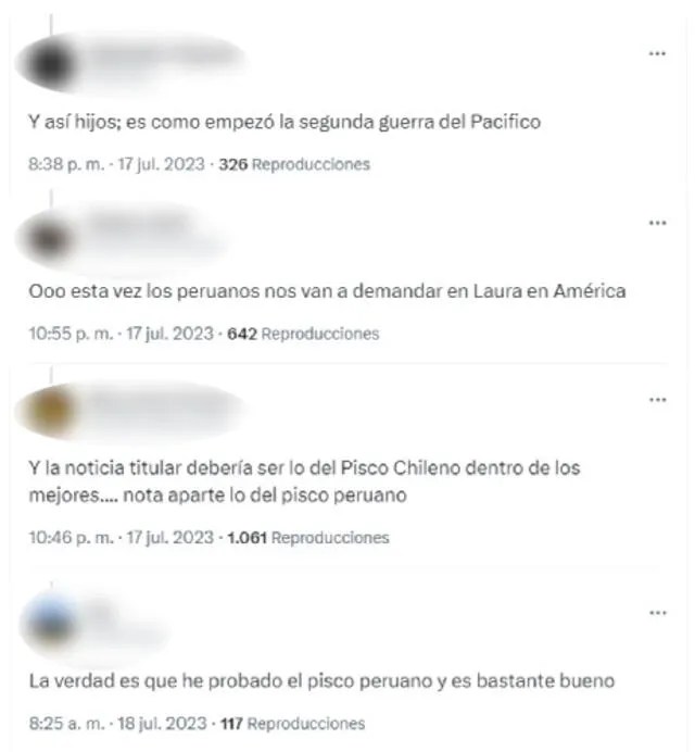 “Y así, hijos, es como empezó la segunda guerra del Pacífico”, “Esta vez los peruanos nos van a demandar en ‘Laura en América’”, “La noticia titular debería ser lo del pisco chileno dentro de los mejores. Nota aparte lo del pisco peruano”, “La verdad es que he probado el pisco peruano y es bastante bueno”, son algunos de los mensajes que se leen en la red social.