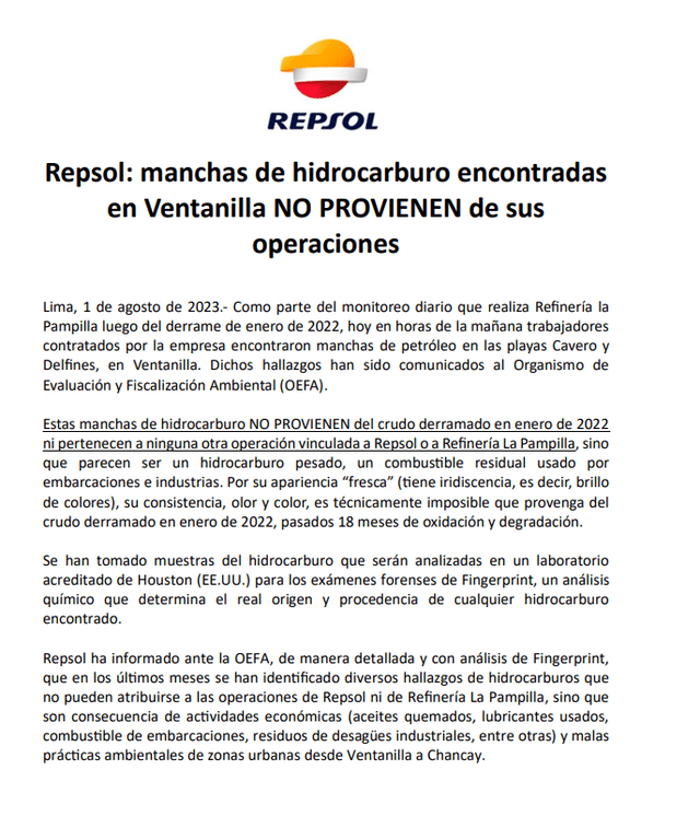 La empresa española Repsol se pronunció al respecto y ha dejado en claro que las manchas de hidrocarburo halladas este martes 1 de agosto en Ventanilla no son consecuencia de sus operaciones en el Perú.