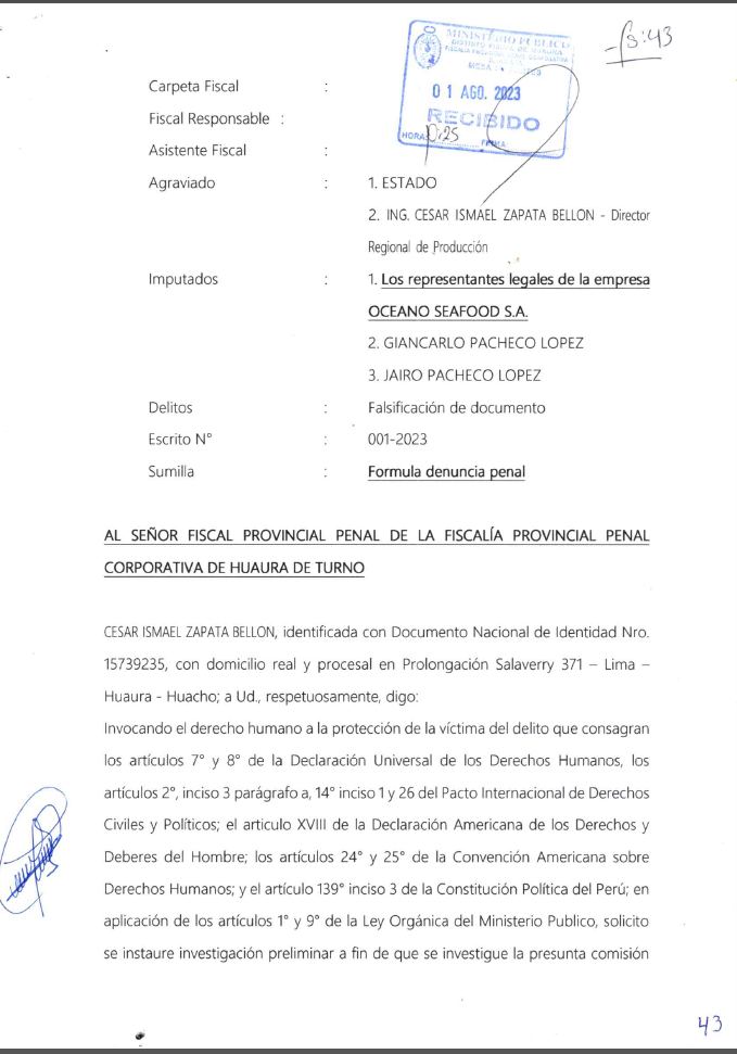 César Zapata Bellón, ex Director Regional de Producción del Gobierno Regional Lima, ha presentado una denuncia penal contra los representantes legales de la empresa Océano Seafood S.A. por el presunto delito contra la Fe Pública en la modalidad de falsificación de documentos, solicitando al Fiscal penal provincial se inicien las investigaciones en sede fiscal.
