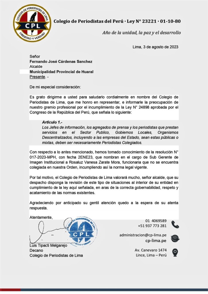 En este documento sin número, Tipacti Melgarejo expresa su preocupación por el incumplimiento de la LEY N°24898, que establece que los jefes de información o periodistas que presten servicios en el sector público tienen que estar necesariamente colegiados y en ese sentido se atreve a cuestionar la designación de la bachiller en Ciencias de la Comunicación VANESSA ZÁRATE MORA, como subgerente de Imagen Institucional de la Municipalidad Provincial de Huaral, porque según su punto de vista no cumpliría con el perfil y porque no estaría colegiada, sin tomar en cuenta este decano a la Constitución Política del Estado y a otras normas de absoluta observancia.