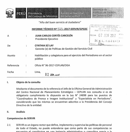 Por lo tanto, lo señalado en el INFORME TÉCNICO N° 525 -2017-SERVIR/GPGSC, es contundente y al parecer no habría sido leído por el decano del Colegio de Periodistas de Lima, LUIS TIPACTI MELGAREJO, ya que en ella se señala en el extremo de CONCLUSIONES, específicamente en el numeral 3.1: “El profesional al momento de incorporarse a la estructura organizacional de una entidad pública adquiere la calidad de servidor civil, por lo que en atención de un criterio de especificidad para regular situaciones jurídicas, corresponde la regulación de su prestación de servicios a las disposiciones en materia laboral».