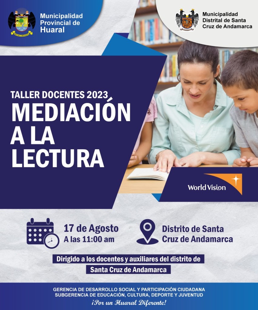 La Municipalidad Provincial de Huaral, a través de la Subgerencia de Educación, Cultura, deporte y Juventud realizará el taller docente: MEDIACIÓN A LA LECTURA, en el distrito de Santa Cruz de Andamarca este 17 de agosto desde las 11:00 a.m. En este taller se detallará ciertas estrategias, para que los niños y adolescentes puedan tomar la lectura como una base importante para la vida, destacándose entre otras: Utilización de diccionarios, Juegos de palabras, Juegos de interpretación de textos, Actividades artísticas y recreativas, Creación de historias y cuentos, Realización de mapas mentales.