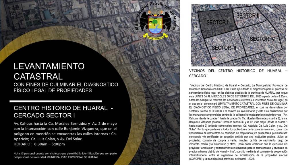 Del lunes 4 al miércoles 6 de setiembre, la Municipalidad Provincial de Huaral, en coordinación con COFOPRI, desplegará a sus técnicos catastrales para llevar a cabo el reconocimiento de datos que, conforman el Centro Histórico de Huaral- Cercado, a fin de realizar el inventario físico.