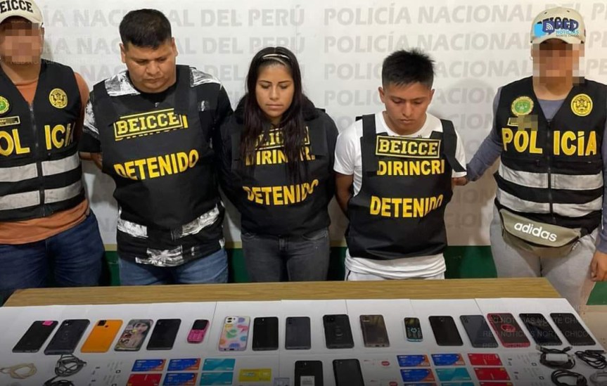 José Almeyda «chato»; Paúl Chancafé «parce» y Emily Gonzalo Soriano «La Fria» a quienes se le incautaron diversas tarjetas de entidades bancarias, 20 celulares, cuadernos con apuntes de número de empresarios a quienes llamaban, amenazaban y extorsionaban.