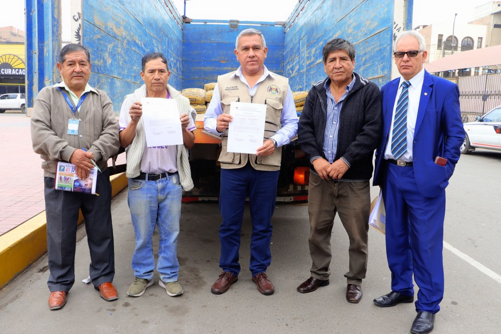 La entrega se llevó a cabo en el frontis de la Municipalidad Provincial a los representantes de las comunidades en mención, quienes agradecieron la preocupación del alcalde por atender su solicitud de donación, que será importante para recuperar el canal de regadío que fue destruido por un huaico.
