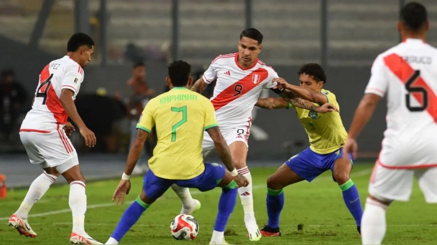 Anulados los dos remates de Brasil, Raphinha recibió la primera tarjeta amarilla por falta contra el capitán peruano, Guerrero, un viejo conocido del fútbol brasilero.
