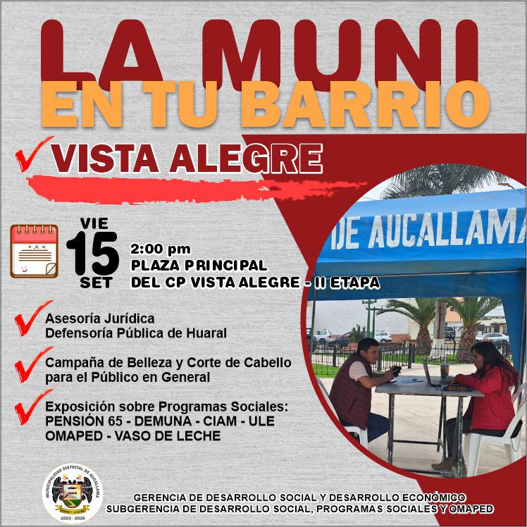 «La Muni en tu Barrio» se realizará en el Centro Poblado de VISTA ALEGRE, el día VIERNES 15 DE SETIEMBRE, desde las 2:00 de la tarde, en la Plaza Principal del mencionado Centro Poblado.