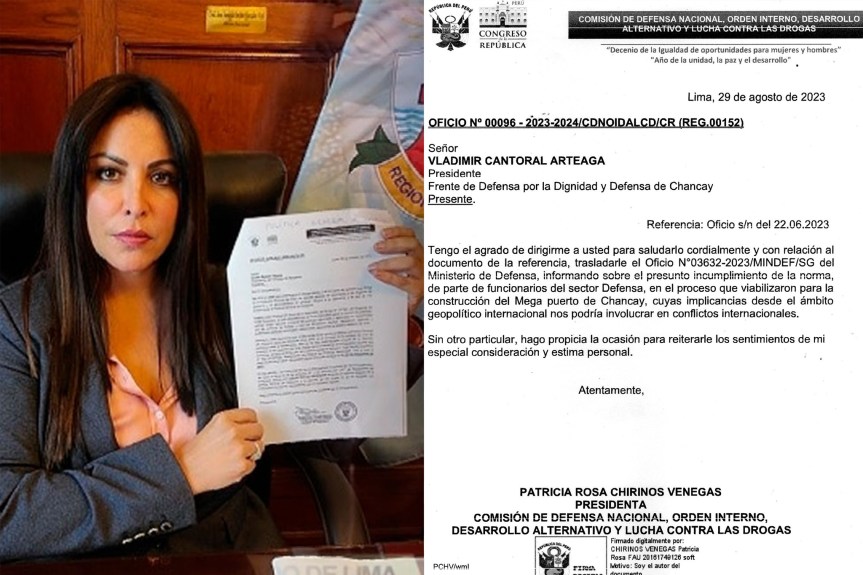 Congresista Patricia Chirinos usted como Presidente de la Comisión de Defensa conoce a profundidad lo preocupante que es la infraestructura del MEGAPUERTO para la Defensa Nacional a nivel de lo geopolitico que nos podría involucrar en conflictos internacionales así usted lo dice en documento que firma el 29 de agosto 2023, entonces es su deber como autoridad tener lealtad con el Perú y asumir su responsabilidad como funcionaria en el Congreso.