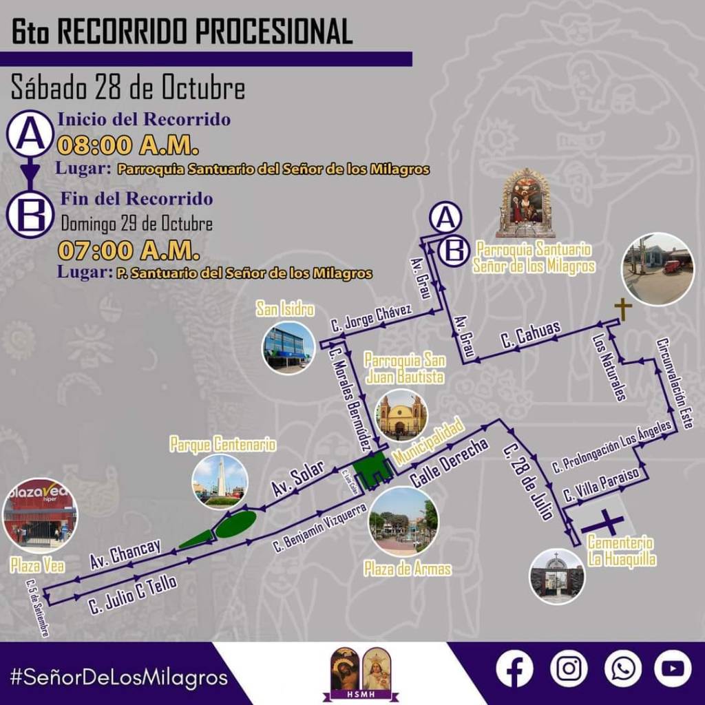 Este sábado 28 de octubre, el anda del Señor de los Milagros saldrá en procesión por sexta vez a recorrer las calles de la ciudad de Huaral; por ello, la hermandad ha publicado las calles que recorrerá la imagen del cristo moreno.